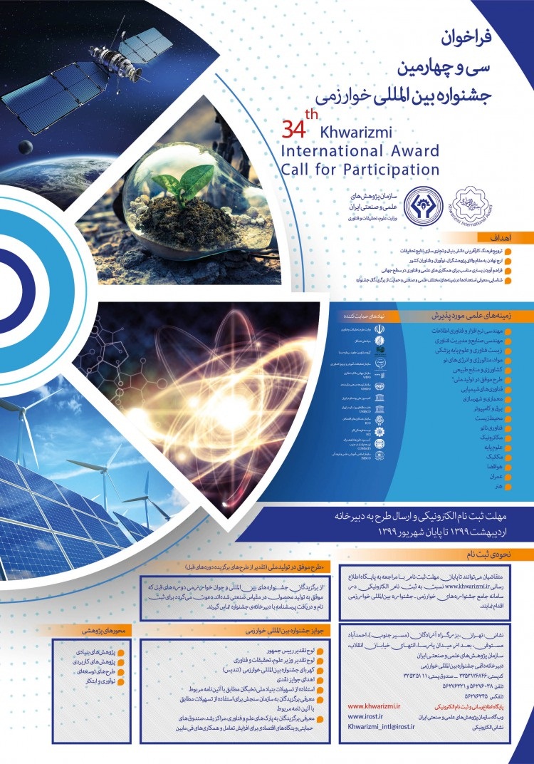 به اطلاع علاقهمندان به شرکت در سی و چهارمین جشنواره بینالمللی خوارزمی میرساند که ثبتنام و ارایه طرح در این دوره از جشنواره آغاز شده است و مهلت ثبت نام تا پایان شهریور ماه سال جاری میباشد. طرحهای قابل پذیرش میبایست در هفده گروه تخصصی شامل فناوریهای شیمیایی، مکانیک، برق و کامپیوتر، هنر، معماری و شهرسازی، کشاورزی و منابع طبیعی، علوم پایه، عمران، مهندسی صنایع و مدیریت فناوری، مواد، متالورژی و انرژیهای نو، زیست فناوری و علوم پایه پزشکی، محیط زیست، فناورینانو، هوافضا، مهندسی نرم افزار و فناوری اطلاعات، مکاترونیک و صنایع دفاعی در پنج محور پژوهشی و فناوری شامل پژوهشهای بنیادی، پژوهشهای کاربردی، طرحهای توسعهای، ابتکار و نوآوری به جشنواره بینالمللی خوارزمی ارایه گردد. از برگزیدگان دورههای قبل که موفق به تولید محصول در مقیاس صنعتی شده اند دعوت میگردد برای ثبت نام و دریافت پرسشنامه به دبیرخانه تماس بگیرند.