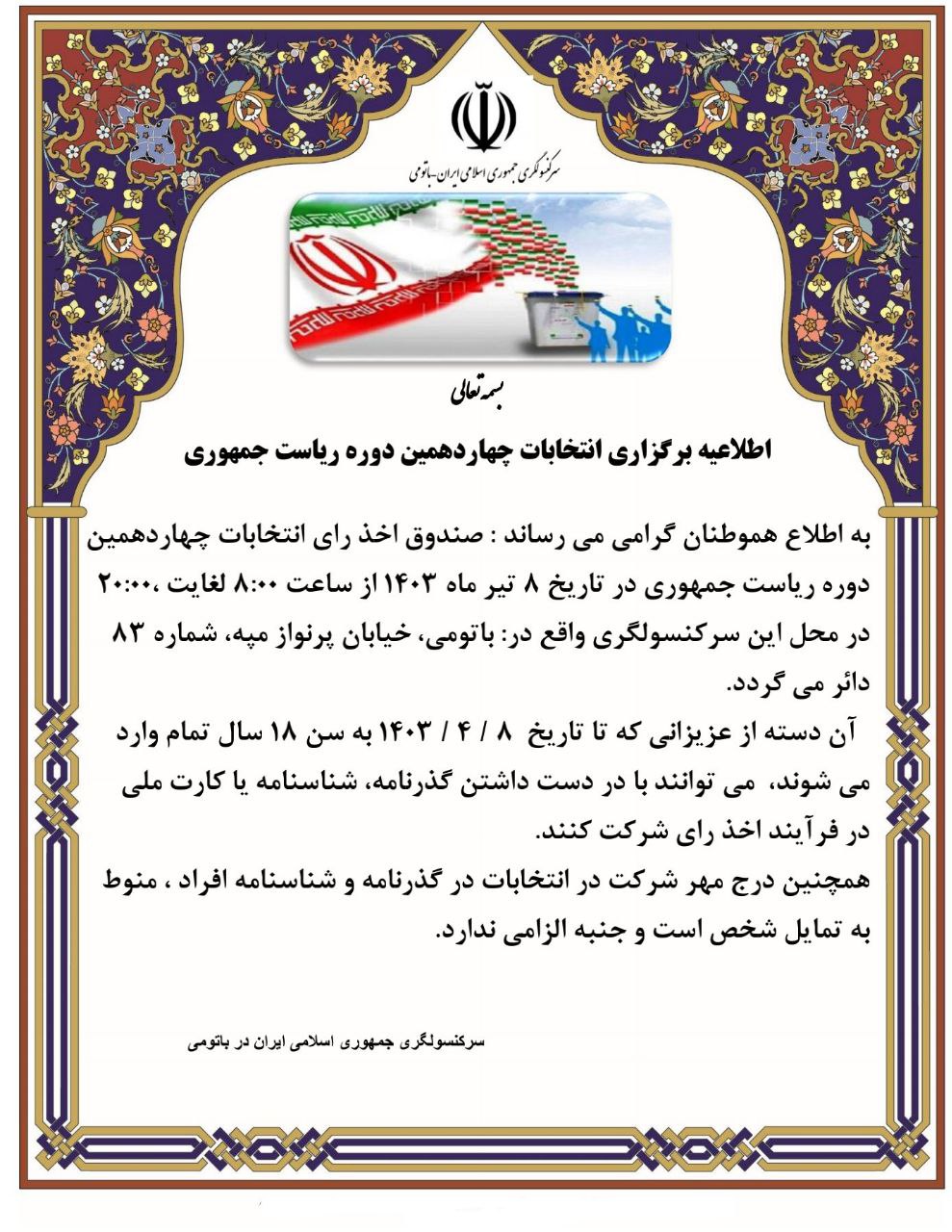 به اطلاع کلیه هموطنان گرامی و ایرانیان مقیم می رساند: همزمان با برگزاری انتخابات چهاردهمین دوره ریاست جمهوری در داخل کشور و در چارچوب ماده 53 قانون انتخابات، صندوق اخذ رای در روز جمعه 8 تیرماه  1403 از ساعت 8 صبح لغایت 8 بعدازظهر در محل این سرکنسولگری واقع در باتومی، خیابان پرنواز مپه، شماره 83، دایر می‌باشد.